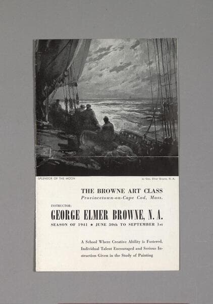 One flyer entitled Class in Drawing and Painting From Nature; Composition and Design, by A.G. Randall, Commonwealth School of Art and Industry, Fitchburg, Massachusetts, 1906. The subtitle reads: "At Boothbay Harbor, Maine, from July 9th to August 11th, 1906." This brochure is 4 unnumbered pages in length, and describes the classes offered, as well as the housing costs, terms and location of the summer program. The school logo, centered on the first page, features an outline view of the eastern half of Massachusetts; Cape Cod is represented by a human arm holding artists' implements. "3-" is written in ms., in pencil, in the upper right-hand corner of the first page.
