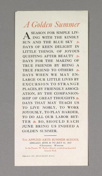One flyer entitled Arts and Crafts at the Chautauqua Summer Schools, published by Chautauqua Institution, Chautauqua, New York, 1930. This 8-page (a single sheet folded into fourths) brochure advertises various summer classes offered by the Chautauqua School of Arts and Crafts. The classes offered fall under three broad categories: Art Education, Industrial Arts, and Practical Craft Courses. The dates of this particular summer program are July 7-August 15, 1930. This brochure is accompanied by a mailing envelope addressed to "Miss Mabel Spofford, Winchester Arms, Gloucester, Mass."