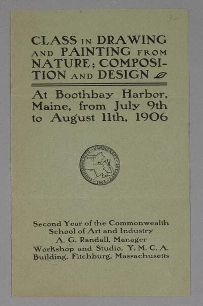 One flyer entitled The Browne Art Class, Privincetown-on-Cape Cod, Mass., instruction by George Elmer Browne, N.A., Provincetown, Massachusetts, 1941. Below the instructor's name on the front is: "Season of 1941. June 30th to September 1st." This advertising/informational brochure for summer art classes is 8 pages in length, including front and back covers. It describes the types of classes offered and terms, among other things, and includes several black and white illustrations, most of which are reproductions of works by George Elmer Browne.
