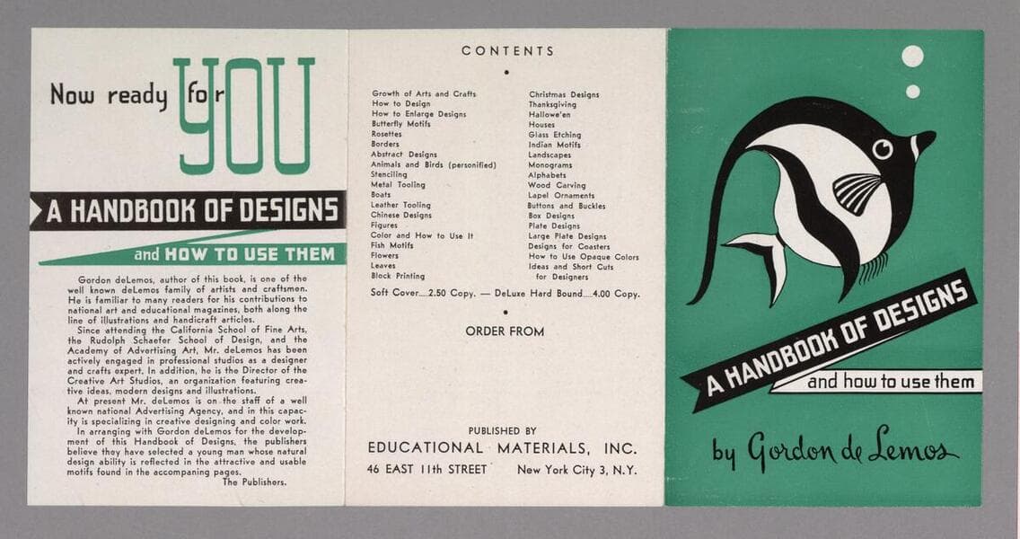 One flyer entitled Arts and Crafts Instruction and Design Books Series, published by Educational Materials, Inc., New York, ca. 1930. This 6-page leaflet is a publisher's advertisement for 3 individual titles and a series of "individual instruction sheets". The titles are: Craftsman's Instruction Handbook; A Handbook of Designs and How to Use Them; and Permodello Modeling (the item is not addressed). Included is an order form. This leaflet is a single sheet, folded into thirds. The dimensions provided are for the folded leaflet.