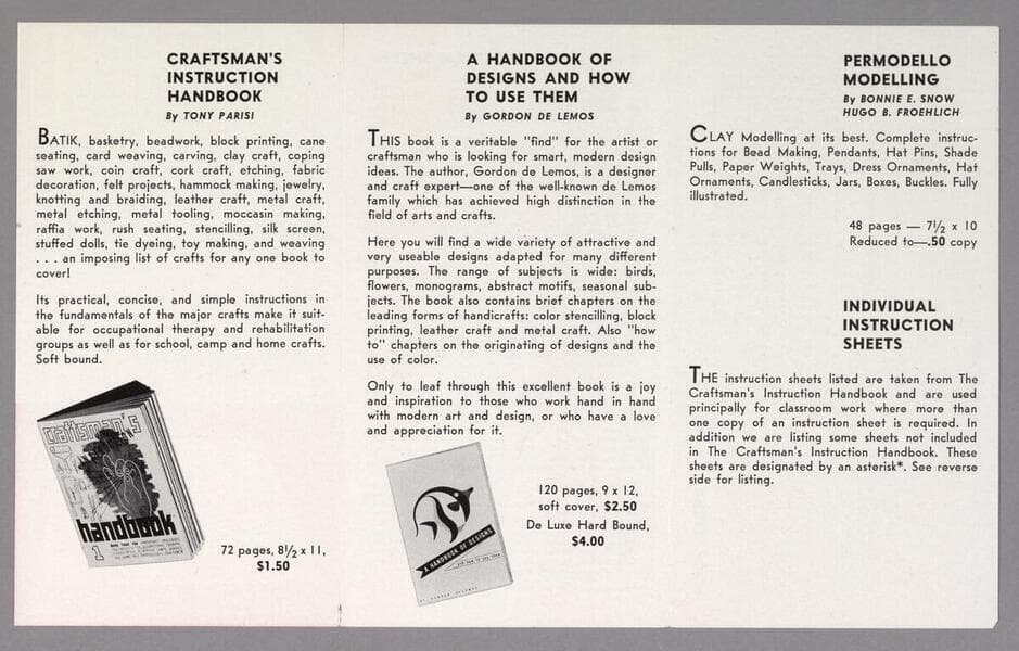 One publisher's advertisement for a book entitled A Handbook of Designs and How to Use Them, by Gordon de Lemos, published by Educational Materials, Inc., New York, ca. 1930. This 6-page (unnumbered) leaflet is made from a single sheet, folded into thirds. It is illustrated with sample designs from the book, and promotional text. A listing of the contents of the book is given on the last page. The dimensions given are for the folded leaflet.