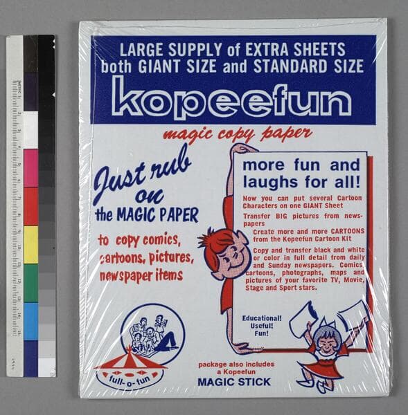 One tracing/transferring kit entitled Kopeefun Magic Copy Paper Kit, manufactured by the Eastern Distribution Corp., Malden, Massachusetts, ca. 1940. The kit is sealed and has never been used, but appears to be comprised of a booklet of images for copying and transferring, and a set of "magic" paper. The front cover is illustrated with a color image of a family of four using a Kopeefun kit. Printed on the back cover is an alphabet for composing one's name or other words.