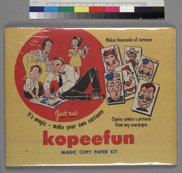 One tracing book entitled Kopeefun Magic Copy Paper Kit, manufactured by the Embree Manufacturing Company, Elizabeth, New Jersey, copyright 1940. The front cover bears a color illustration of a family of four using a Kopeefun kit; the title is below the image. The back cover contains promotional text for the drawing kit, and declares Kopeefun kits "Fun for Everyone from 5 to 55." "Pat. pending, Copyright 1940" is printed on the bottom of the back cover. The book contains 24 unnumbered leaves of images and partial images for copying by rubbing. The kit includes several sheets of "magic paper", which are placed over an image and then rubbed with a hard edged tool (such as a butter knife). The printed image is transferred to the magic paper, which, in turn, can be transferred to another sheet of paper or any surface. The first few pages of this book contain directions and suggestions for use, and the remaining leaves contain elements of cartoons and images. For example, there is a leaf of hairstyles, another of hats, another of mouths, etc. These can be combined to create a wide variety of images.