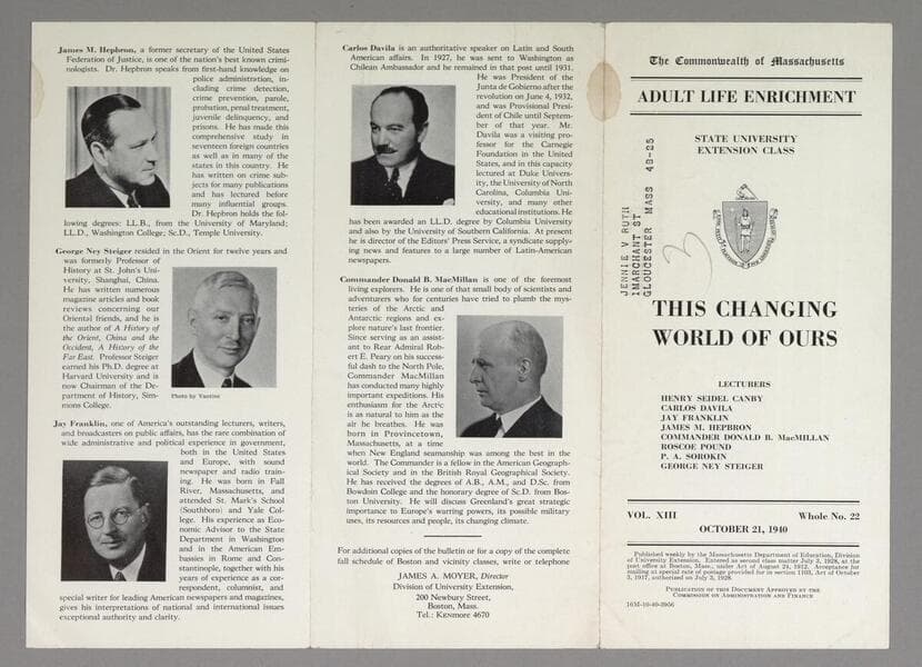 One flyer entitled Official Register of Harvard University, Harvard Summer School: An Unusual Program for Teachers of Art, Vol. XXXVIII, April 4, 1941, No. 15, published by Harvard University, Cambridge, Massachusetts, 1941. This 8-page brochure is an advertisement for a program offered by Harvard Summer School. In it are listed the courses offered, a description of the art workshop, the staff, facilities, social life, fees and credits, and an address to write for further information. Accompanying this brochure is a business reply postcard to subscribe to the Official Register of Harvard University. Also accompanying this leaflet is a mailing envelope addressed to "Miss Mabel Spofford, Supervisor of Drawing, Public Schools, Gloucester, Mass."