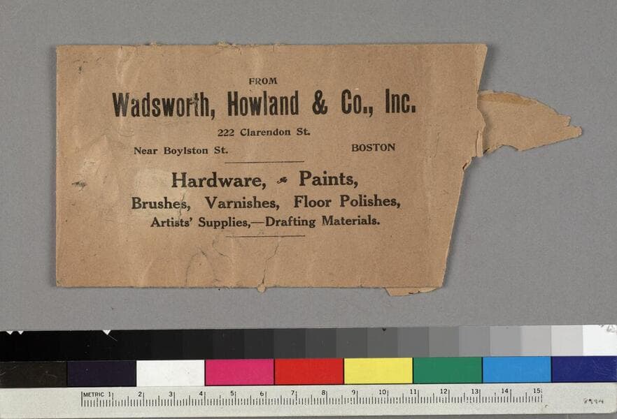 One boxed set of watercolor paints entitled Water Color School Box, manufactured by Wadsworth, Howland & Co., Boston, Massachusetts, ca. 1895. The set is comprised of 10 small cakes of watercolor paint set within two rows of metal supports, one quill brush, one wooden stick, and a small stick of charcoal. The set is housed within a metal box; the lid is divided into four sections: the top two sections contain the manufacturer's name and address, the bottom two contain the title. The box is colored green and has gold lettering. A printed slip of paper is laid into the bottom of the box underneath the two rows of paints, so only a portion of it is legible: "When you need more of any of the colors in this box we will furnish them at short notice. Wadsworth, Howland & Co., Inc."