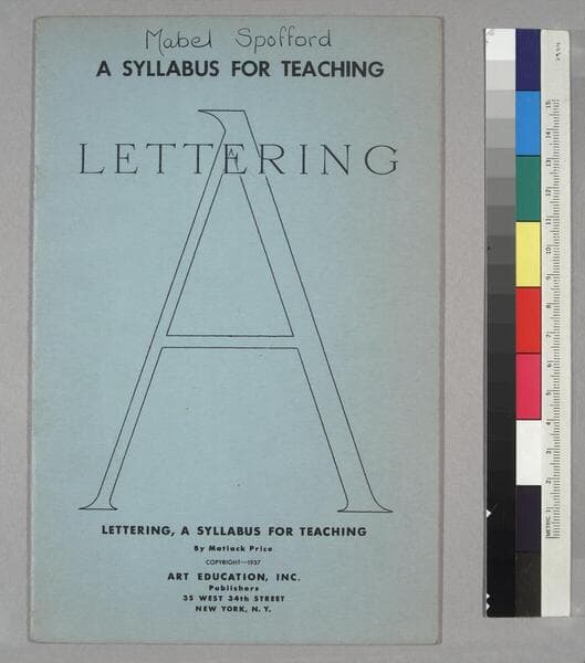 One instructional book, copyright 1937, entitled Lettering, Its History, Principles & Practice, by Matlack Price, ["Basic Alphabets and many other illustrations were drawn by Otto Munzinger] published by Art Education, Inc., New York, New York. This instructional book is 32 numbered pages in length, and is illustrated with black and white images. Some of the items discussed are letter spacing, serifs, italics, and different fonts "in action". The book is bound in (faded) blue paper. "Mabel Spofford" is written in ms. at the top of the front cover.