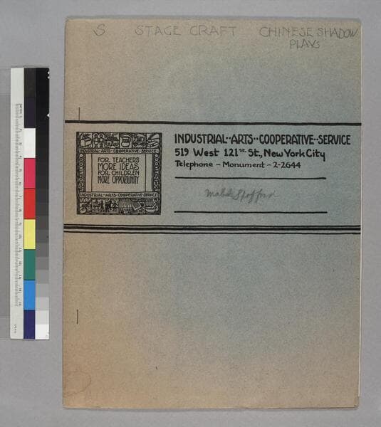 One drawing book entitled Bartholomew's National System of Industrial Drawing, Light, Shade & Shadow, New Edition, No. 17, by William N. Bartholomew, published by Potter, Ainsworth & Co., Boston, New York and Chicago, 1884. This 20-page book is illustrated with 39 lithograph illustrations. The first 2 pages contain an outline of this book and various rules that apply to drawing with light, shade and shadow. On the last page are several notes and tips pertaining to lights, shade, and shadow. The pages in between are devoted to the actual drawing exercises. Some of these include: a treescape, a bucket, ornamental designs in relief, floral designs, and various outdoor scenes. Each exercise, one per page, is comprised of textual instruction, an image or images, and ample space for drawing. None of the exercises have been completed. The front cover is decorated with a simple but decorative frame around the text, with an Egyptian aten below the edition statement, and the publisher's statement is below that. The book number is printed in both the upper left and right-hand corners. The insides of the front and back covers are blank. On the back cover is a publisher's advertisement for various "Popular Educational Series". ".50" (price) is written in ms., in pencil, in the upper left-hand corner of the front cover.