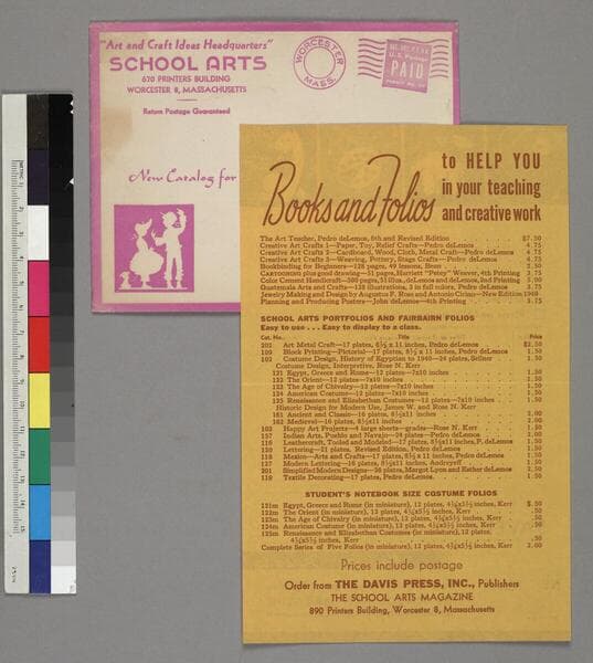 One publisher's order form entitled School and Teachers' Order Form, School Arts Magazine, issued by the publishers of School Arts Magazine, Worcester, Massachusetts, ca. 1940. The front side of the order form is blank, the other side lists portfolios and books for sale. A return envelope accompanies the order form. Both are printed on pink paper.