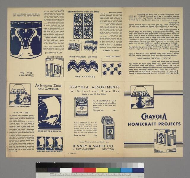 One manufacturer's advertisement entitled 'Crayograph': The Original Pressed Crayon, published by The American Crayon Company, Sandusky, Ohio, 1931. The leaflet is 8 numbered pages in length and is made from a single sheet, folded into fourths. It is illustrated with blue and green images, and contains suggestions for various craft projects using Prang Crayograph crayons.