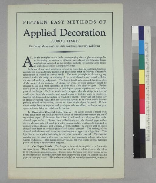 One set of art reproductions entitled Ships in Decoration, by Pedro J. Lemos, published by The School Arts Magazine, Davis Press, Worcester, Massachusetts, 1929. This is a portfolio of 15 numbered plates of art reproductions of ships. Various methods of art are represented and include: stencils, batik, pen and ink drawing, tiles and patterns. The plates are not individually labeled, but below each set of images are several lines of text that provide suggestions or directions for use in design. The set of plates is housed within an illustrated paper folder.