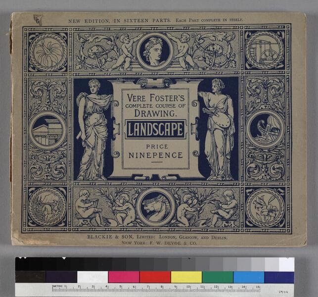 Three drawing books, entitled Vere Foster's Drawing Copy Book, Nos. M1, I2 and Q3., by E. Duncan, John Callow, and George Whitaker, published by Blackie & Son, London, Dublin, Edinburgh, and Glasgow, ca. 1868. These three books are part of a series, Vere Foster's Drawing Copy Book. Book M1 is part of the Marine series (in 4 parts) and is titled "Boats, Foregrounds, and Nautical Bits". Book I2 is part of the Ornamental Forms series (in 4 parts) and is titled "Freehand Ornament, Classic and Renaissance"; Book Q3 is part of the Human Figure series (in 4 parts) and is titled "Rustic Figures". The books are 16 (unnumbered) pages in length; each of which contains a black and white illustration, with a blank page for copying. In Book M1, the instructional text begins on the inside of the front cover, and continues on to both sides of the back cover. The back covers of Book I2 and Q3 contain publisher's advertisements and outlines for this and other Vere Foster's series. The illustrations, which are primarily in outline form, are signed by both Callow and Whitaker in Book M1. The images of Book M1 (Marine) include views of nautical implements and boats of various kinds. The front cover is bordered with a decorative design of Celtic origin, and in the center is an engraved portrait of "Her Majesty Queen Victoria at the age of eight, from a portrait presented to Lady Albina Foster". Also on the front cover is the complete list of the drawing and lettering books in the series. The front covers of Books I2 and Q3 are different from that of M1 but similar to each other; each is primarily divided into 4 sections: one large section on the left half of the cover, with the remaining three sections comprising the right-hand half. The largest half contains a sample image from those contained within. These 3 sections are vertically oriented; the top third frames the statement "Embracing every description of drawing, with paper for copying. New Edition"; the middle third contains the name of that individual lesson book; the bottom third frames the price and the statement "Sanctioned by The Department of Science and Art. Adopted by The Board of National Education in Ireland." The images in Book I2 (Ornamental Forms, Classic and Renaissance) are Italian, Greek, Roman and English floral decorative ornaments. The images in Book Q3 (Human Figure, Advanced Figure in Outline) are of hands, feet, and whole-body figures. Each of the 3 books has some ms. writing on its front cover: M1 has "G.R.M." in ink in the upper left-hand corner within the decorative frame; "DK" in pencil written in the upper left-hand corner, and "[pounds sterling symbol] 2.50" (price) written in the upper right-hand corner. Book I2 has "G.R.M." written in the upper left-hand corner within the frame; "D/N" is written in the upper left-hand corner; and "[pounds sterling symbol] 2.00" (price) in the upper right-hand corner. Book Q3 has "D/N" written in the upper left-hand corner, and "[pounds sterling symbol] 2.50" (price) in the upper right-hand corner.