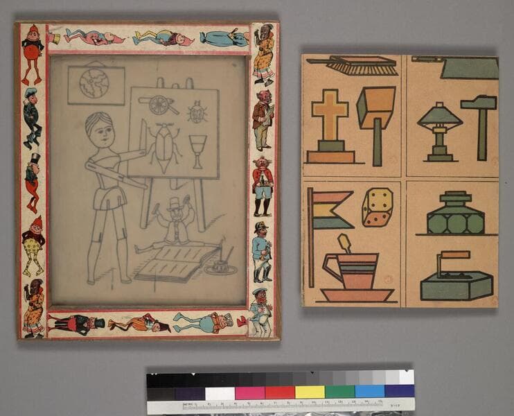 One glass drawing slate within a wooden frame, ca. 1885. The frame is constructed of four separate pieces that are joined together by black string; the corners have been carved to allow the string to be secure. A wooden back with a pivoted brace holds the slate in place. Accompanying the slate are 6 leaves of double-sided woodcut images for use with the slate. Neither a manufacturer's name nor a date are provided. Title supplied by cataloger.