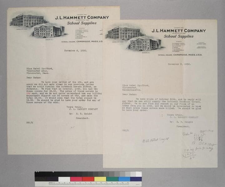 Two typescript letters from the J. L. Hammett Company to Miss Mabel Spofford