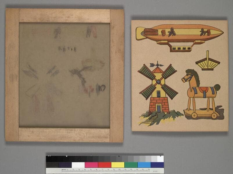 One glass drawing slate within a wooden frame, ca. 1885. The frame is constructed of four separate pieces that are joined together by black string; the corners have been carved to allow the string to be secure. A wooden back with a pivoted brace holds the slate in place. Accompanying the slate are 6 leaves of double-sided woodcut images for use with the slate. Neither a manufacturer's name nor a date are provided. Title supplied by cataloger.