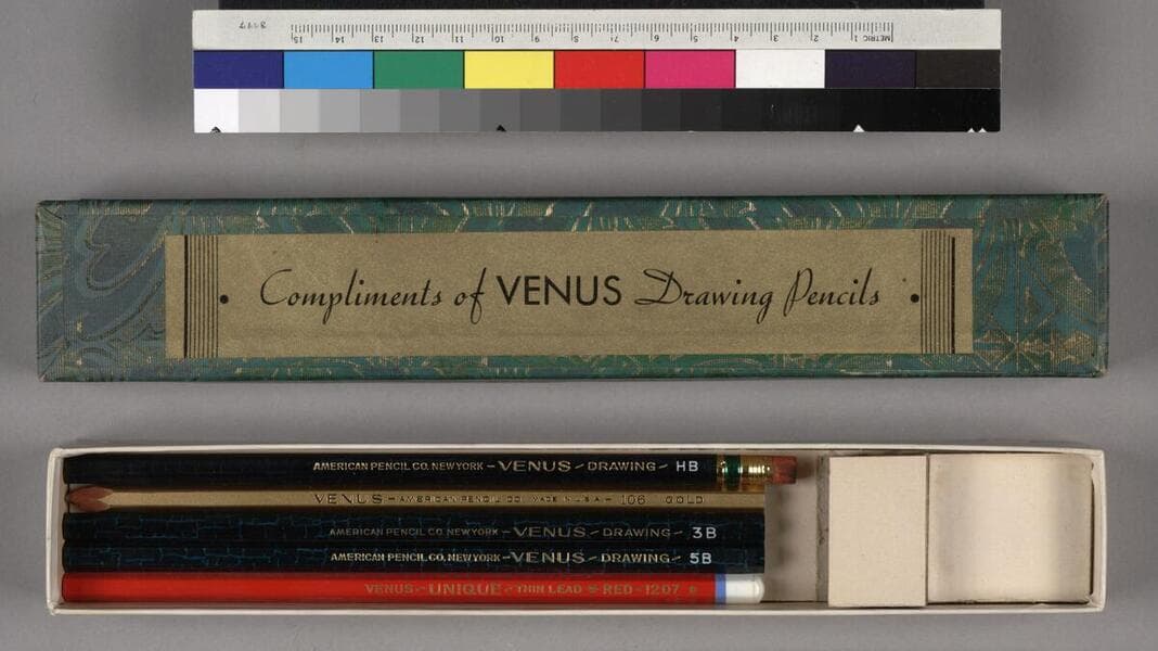 One boxed set of lead pencils entitled 'Venus' Perfect Pencils, manufactured by the American Lead Pencil Co., New York and London, ca. 1910. The box was issued with 5 lead pencils and an eraser; only three pencils remain. On the top lid of the box is an illustrated range of the various degrees of color the pencils are available in: "Made in 17 black and 2 copying degrees: each degree guaranteed never to vary." Printed on the underside of the lid is information about the Venus eraser.