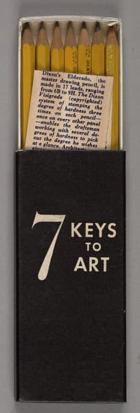 One boxed set of lead pencils entitled Dixon's Eldorado: 'the master drawing pencil,' manufactured by the Joseph Dixon Crucible Company, Jersey City, New Jersey, ca. 1940. The set was issued with one dozen pencils; one is missing from this set. The pencils are varying degrees of hardness. The box is blue with gold lettering; the outer box serves as a slipcase for the inner box.