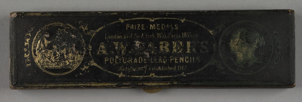 One boxed set of lead pencils entitled 'Venus' Perfect Pencils, manufactured by the American Lead Pencil Co., New York and London, ca. 1910. The box was issued with 5 lead pencils and an eraser; only three pencils remain. On the top lid of the box is an illustrated range of the various degrees of color the pencils are available in: "Made in 17 black and 2 copying degrees: each degree guaranteed never to vary." Printed on the underside of the lid is information about the Venus eraser.