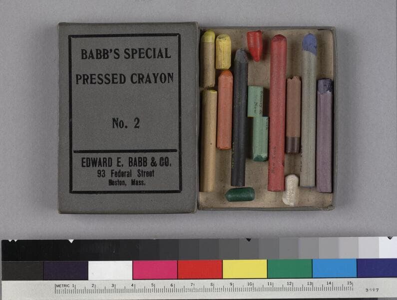 Five sets of boxed colored crayons manufactured by the Standard Crayon Mfg. Co., Danvers, Massachusetts, circa 1914. Set 10: Crayel, No. 184. (16 wax crayons in a flip-top box) Set 11: Crest Light Artists Crayon. (crayon pieces in a box with a lid) "Mabel Spofford, 8 Cherry Street, On hand 1914" written in ms., in pencil, on lid. Set 12: Crest Light Artist's Crayons, No. 814 (8 wax crayons in a slipcase box) Set 13: The Artco Pastel, No. 8 (8 wax crayons in a box with lid). Set 14: The Murillo Art Crayons, with book for coloring (8 wax crayons in box with lid). Title supplied by cataloger.