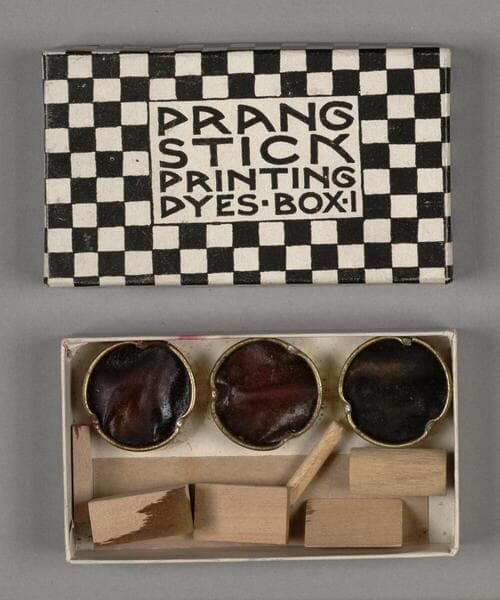 One boxed dye set entitled Prang Stick Printing Dyes: Box No. 1, manufactured by The Prang Company, New York, Chicago, Boston, Atlanta ,and Dallas, ca. 1910. As stated on the box lid, the set is comprised of "3 color caps (12 pads); 1 water cap (4 pads); 6 printing sticks." Five of the printing sticks remain; some of the color caps have been used. All four "tins" of color and water caps have been used, as have the sticks. The directions for use are printed on the lid.