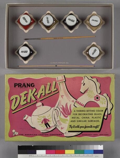One boxed dye set entitled Prang Stick Printing Dyes: Box No. 1, manufactured by The Prang Company, New York, Chicago, Boston, Atlanta ,and Dallas, ca. 1910. As stated on the box lid, the set is comprised of "3 color caps (12 pads); 1 water cap (4 pads); 6 printing sticks." Five of the printing sticks remain; some of the color caps have been used. All four "tins" of color and water caps have been used, as have the sticks. The directions for use are printed on the lid.