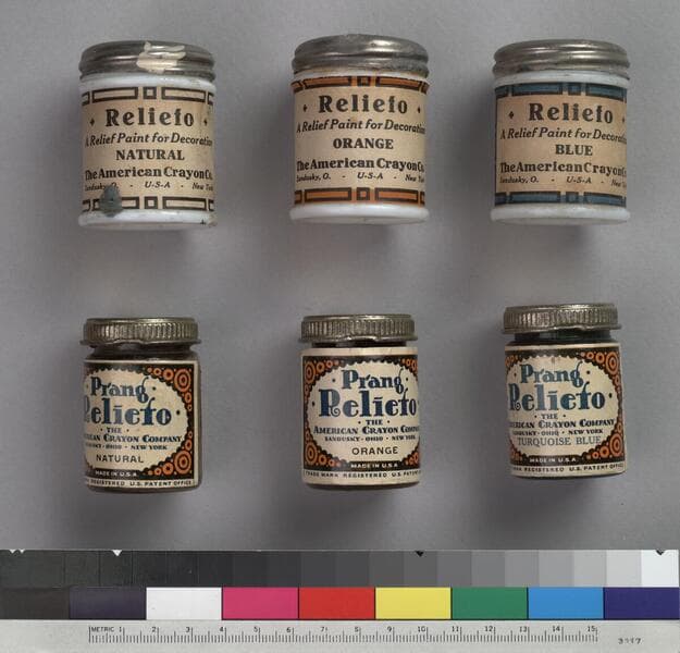 Three boxes of paint labeled AmazArt Colors, manufactured by Binney & Smith Co., New York, ca. 1935. Each of the three yellow and red boxes contains a 2 oz. tube of paint and printed directions for use. The three colors here are green, blue, and vermilion. Promotional text on the sides of the boxes reads: "New sensational art medium. Easy to use no special talent needed to hand-decorate fabrics, wood, glass, china and other surfaces," and "Draw, paint, design, write, mark with tube tip, no waiting to dry - no fixing of colors, made in vermilion, yellow, green, blue, brown, black."