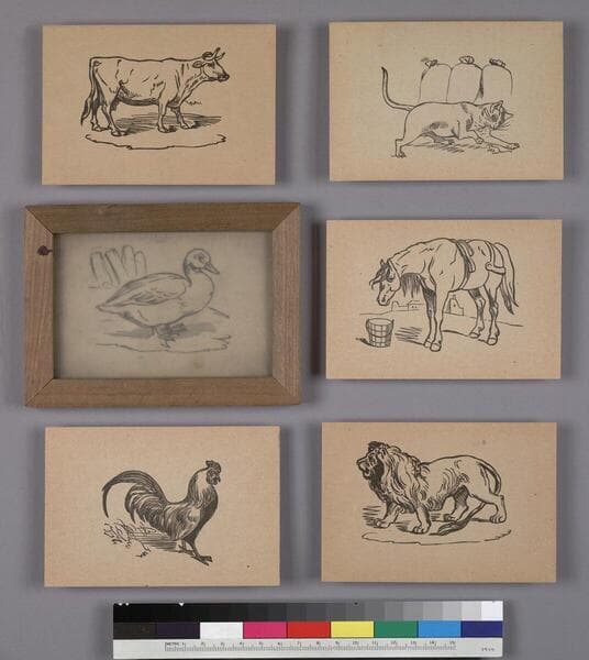 One glass drawing slate contained within a wooden frame, ca. 1900. A wooden panel and brace secure the slate within the frame. Accompanying the slate are 4 sheets of images for copying, one of which is chromolithographed. Printed in the lower left-hand corner of the other sheets are the words "Natl. School Slate Co." The slate bears neither manufacturer's marks nor a date. Title supplied by cataloger.