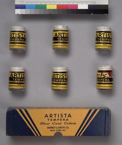 One glass jar of paint labeled Artista Tempera, in black, manufactured by Binney & Smith Co., New York. The jar is trial size.