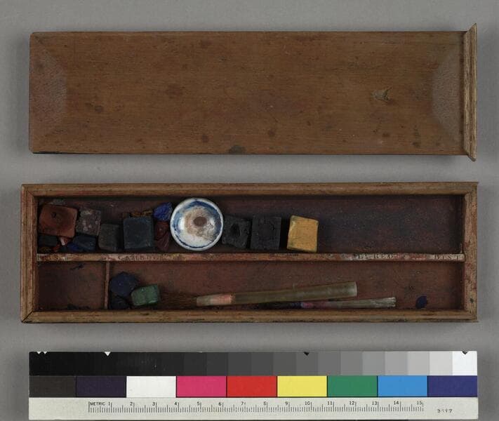 One boxed watercolor paint set, untitled, manufactured by Winsor & Newton Limited, London, England, ca. 1880? The set is comprised of 12 rectangular cakes of watercolor paint, two porcelain 3-welled dishes, a cut glass dish, a bone brush rest, two small, round dishes, a wooden stick, one piece of charcoal, and several pieces of chalk. The set is housed in a handsome wooden box that has hidden compartments, a pin-locked bottom drawer, and a hinged lid. Mounted to the underside of the lid is a maroon and gold label which reads "Winsor & Newton Limited, London" within a crown-like border. The text within the frame reads: "Artists' Colourmen by Special Appointment to Her Majesty and Their Royal Highnesses, The Prince and Princess of Wales. 38 Rathbone Place." Each of the cakes of paint are embossed, some with an image of a crown and some with a mythological iconographic figure. This same figure is at the center of the label on the underside of the lid, as well as on an additional label within the box. Some of the cakes of paint are wrapped in foil and paper wrappers bearing Winsor & Newton's name. Title supplied by cataloger.