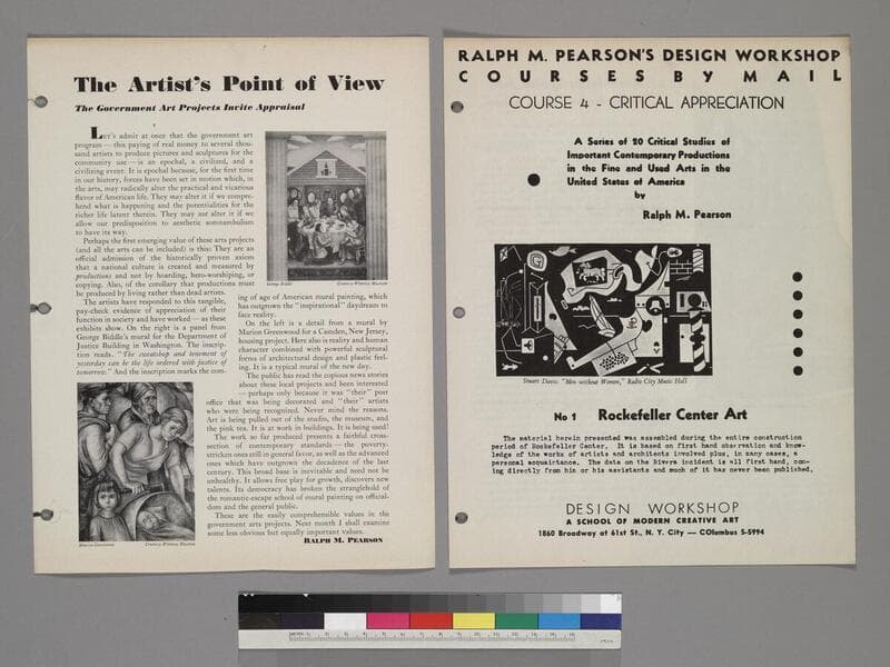 Two issues of Design Workshop, No. 1 and Bulletin 2, by Ralph M. Pearson, published by Ralph M. Pearson, New York. Bulletin 2 is dated October 1935. Each is 4 pages in length. Accompanying these is an envelope from the Ralph M. Pearson Design Workshop addressed to Mabel Spofford.