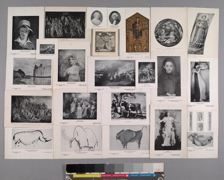 One set of art reproductions of paintings and murals, published by Brown-Robertson Co., Inc., New York, ca. 1924. There are 124 individual reproduction cards within this incomplete set; many are duplicates. All of the cards are color, and include the number of the image (presumably the number within the Brown-Robertson series), the title of the painting, and the artist's name. Most cards name the collection or museum where the original resides, as well as the publisher. Some of the paintings represented in this set include: "Up the Hudson" by Bellows; "Paris Boulevarde" by Renoir; "Infanta Maria Theresa" by Velasquez; "Mona Lisa" by Da Vinci; "The Blue Boy" by Gainsborough; "Jane Seymour" by Holbein, and "Mother of the Artist" by Whistler. One use of these such cards was as a way of introducing students to art of different cultures. This set of art reproductions belonged to Mabel Spofford. Title supplied by cataloger.