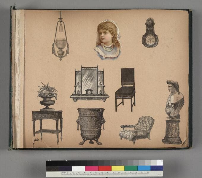 One scrapbook, untitled, created ca. 1885. The scrapbook is 22 unnumbered pages in length, and is made from paper and images pasted to the leaves of an instruction book by Walter Smith (the inside back cover of the instruction book is the only page not covered with created images; this page is a publisher's advertisement for other books by Walter Smith). Each page of the scrapbook is created to resemble a room within a home, such as a parlor, a bedroom, a library, and a kitchen. All of the rooms feature drapes and curtains made from colored and textured papers. The images throughout the scrapbook are a combination of black and white images cut from magazines and newspapers and die-cut chromolithograph images. Included among them are people, furniture, and flowers. The scrapbook's compositor is not given; an accompanying note written by DK reads, in part: "Child's collage- 1875-80? (Pasted into Walter Smith instruction book.)" The scrapbook was purchased by DK in 1980 at the New England Trade Center. Title supplied by cataloger.