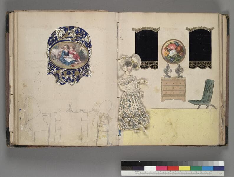 One scrapbook, untitled, comprised of hand-painted paper cutouts and decorative pieces of paper, ca. 1876. The scrapbook is 18 unnumbered pages in length, within which two full Victorian rooms are represented. Each of the two rooms fill 2 pages (an opening) and contain images of armchairs and couches, curtains, framed pictures hanging on the walls, a pipe organ, hanging plants and rugs. Most of the pages within the scrapbook are blank. Title supplied by cataloger.