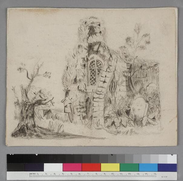 One drawing book of original drawings, untitled, creator unnamed, ca. 1845. The book is 16 unnumbered leaves in length, and contains original pencil drawings primarily of houses and animals. The drawings are undated and unsigned. Tissue paper guard sheets are bound in between each of the leaves. An accompanying not from DK reads, in part, "After Coe drawing cards?" Title supplied by cataloger.