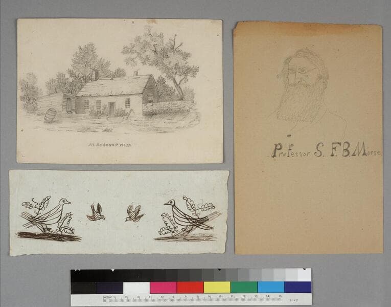 One set of 13 original drawings created by Emma Barnes, ca. 1915. The first 6 drawings (Env. 45-50) are charcoal drawings of geometric solids; the next 3 (Env. 51-53) are also charcoal drawings, the first two are of a statue face, the third of a bowl; the next 2 (Env. 55-56) are colored chalk drawings, and the last envelope (Env. 57) is a two-sided leaf of ms. notes, in pencil. The fist 5 drawings are signed "E. Barnes." Title supplied by cataloger.