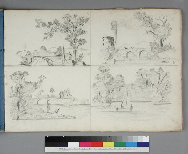 One drawing book of original drawings, untitled, artist unnamed, ca. 1890? The book is 8 unnumbered leaves in length, and contains 8 original pencil drawings, primarily of landscapes. None of the drawings are signed. The book is without covers. Tissue paper guard sheets are bound in between the leaves. Title supplied by cataloger.