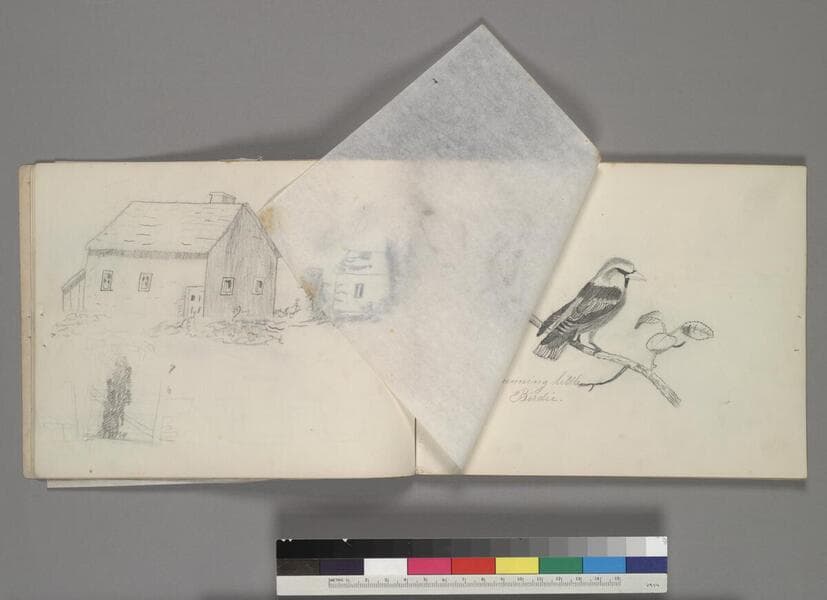 One drawing book of original drawings, untitled, created by M.H.B., 1852. The drawing book is 10 unnumbered leaves in length, and contains original pencil drawings, mostly of landscapes and buildings. The drawing book is bound within marblized paper covers, and is untitled. The first drawing is signed "M.H.B" and is dated 1852; some of the other drawings are also dated 1852. Colored tissue paper guard sheets have been laid in between the leaves. Title supplied by cataloger.