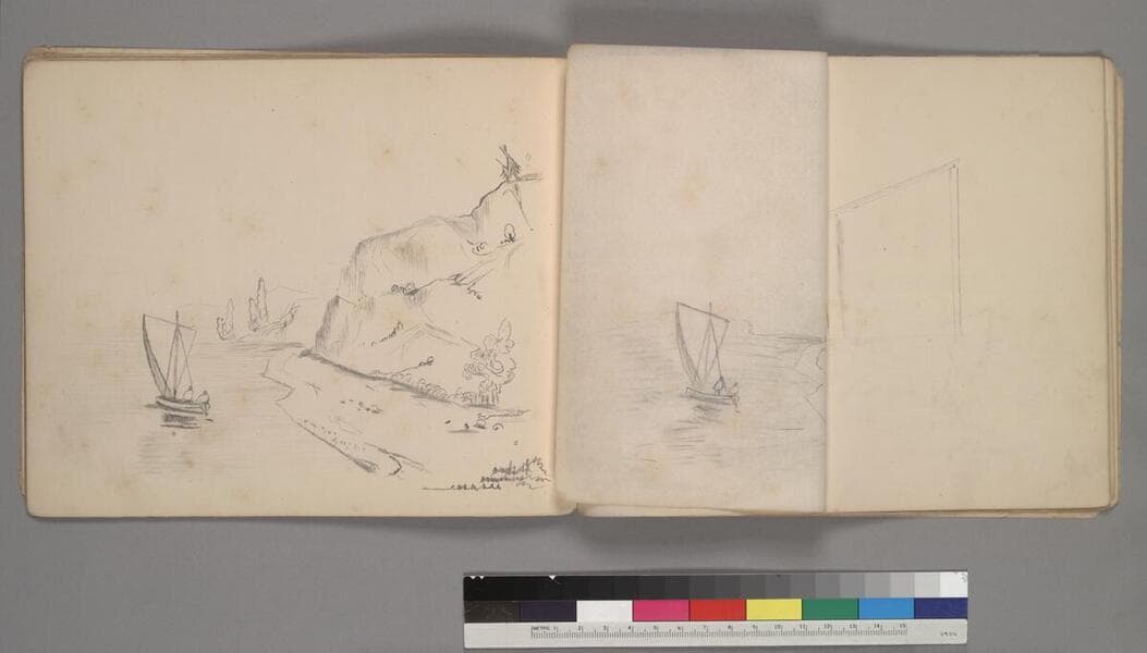 One drawing book of original drawings, untitled, created by M.H.B., 1852. The drawing book is 10 unnumbered leaves in length, and contains original pencil drawings, mostly of landscapes and buildings. The drawing book is bound within marblized paper covers, and is untitled. The first drawing is signed "M.H.B" and is dated 1852; some of the other drawings are also dated 1852. Colored tissue paper guard sheets have been laid in between the leaves. Title supplied by cataloger.