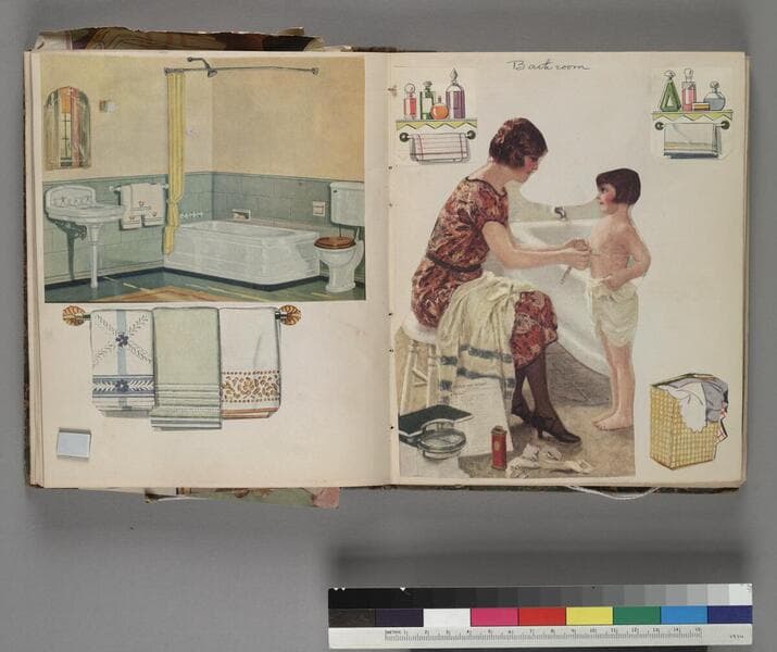 One scrapbook, untitled, comprised of hand-painted paper cutouts and decorative pieces of paper, ca. 1876. The scrapbook is 18 unnumbered pages in length, within which two full Victorian rooms are represented. Each of the two rooms fill 2 pages (an opening) and contain images of armchairs and couches, curtains, framed pictures hanging on the walls, a pipe organ, hanging plants and rugs. Most of the pages within the scrapbook are blank. Title supplied by cataloger.