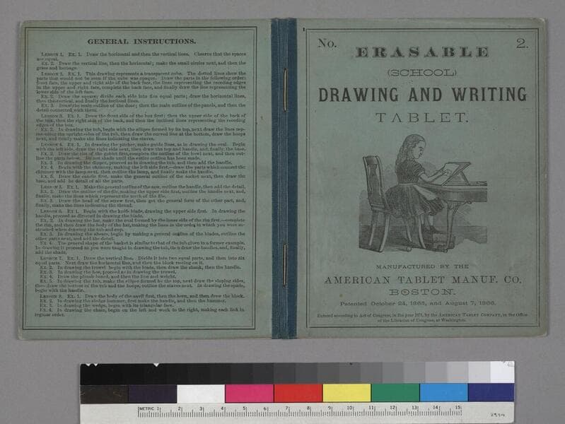 One drawing book of original drawings entitled Drawing Tablet, artist unnamed, manufactured by the Pennsylvania School Supply Co., Philadelphia, ca. 1890? The drawing book is 14 unnumbered leaves in length, and contains original pencil drawings of geometric shapes, patterns and designs, some of which are labeled. The front and back covers are illustrated with a woodcut scene of a seated woman painting in her studio. Below the image is the series phrase "Student's Series - No. 2221." Tissue paper guard sheets are bound in between each of the leaves.