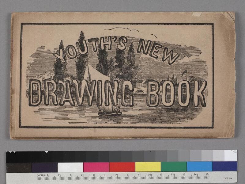 One drawing book entitled The New Progressive Drawing Book, Containing Lithographic Sketches, and Drawings of Landscape Scenery, Designed for Self Instruction, published by C.P. Huestis, New York, 1847. This drawing book is 24 unnumbered pages in length and contains lithograph images only (no text). There are several different images per page, some of which are landscapes and seascapes. Title and publication information on the front cover are within a simple frame ornamented by acorns. The insides of the front and back covers are blank, and the back cover is a publisher's advertisement from C.P. Huestis. "35-" (price) is written in ms. in the upper right-hand corner of the front cover.