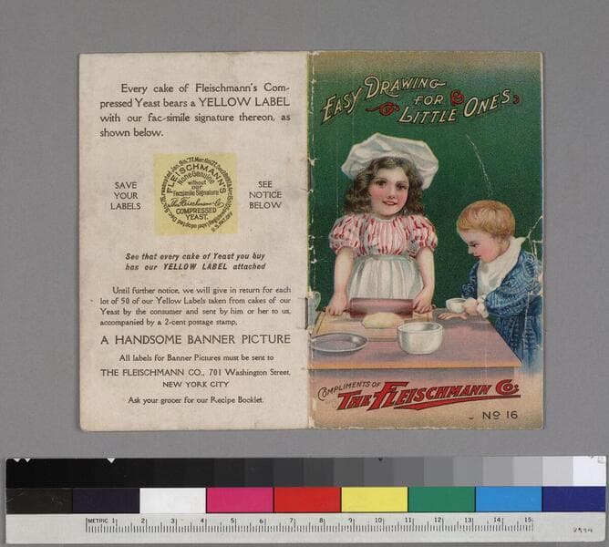 One manufacturer's advertisement/drawing book entitled "Satin Gloss" Drawing Book, for Little Folks, published by David S. Brown & Co., New York, ca. 1885. This 8-page booklet is a promotional piece for Satin Gloss soap and is comprised of 8 different lithograph advertising images, each with a sheet of tracing paper bound in. The covers are chromolithographs; the front cover features a little girl holding two rabbits; the back cover pictures two little girls, one of whom is whispering in the ear of the other. Each of the images for tracing are captioned with promotional phrases; an image of a horse-drawn cart is captioned "This is one of the trucks that delivers Satin Gloss Soap to your grocer." The insides of the front and back covers contain advertising text. Each of the images has been copied onto tracing paper.