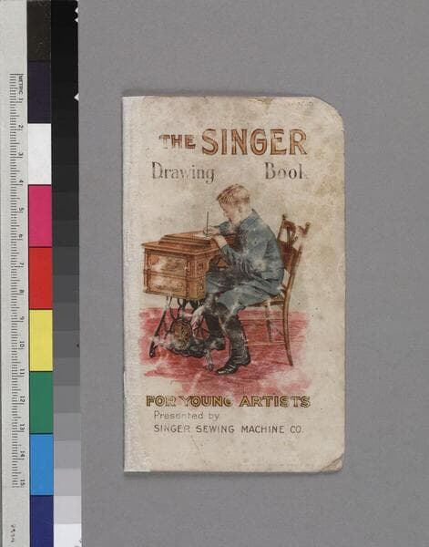 One drawing book/manufacturer's advertisement entitled The Singer Drawing Book for Young Artists, published by Singer Sewing Machine Co., ca. 1900. This promotional booklet contains 8 unnumbered pages of illustrations, each with its own sheet of tracing paper. The color illustration on the front cover is of three children gathered around a desk; the two little girls are watching the older boy draw. The color illustration on the back cover is the Singer Sewing Machine logo (a red S) superimposed on an image of a seated woman who is sewing with her Singer sewing machine. Some of the illustrations for tracing are promotional; the first image is of a sewing machine. The other illustrations are of children and animals. None of the images have been traced. "3-" (price) is written in ms. in the upper right-hand corner of the front cover.