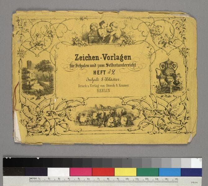 One drawing book entitled Elementary Drawing Book; A Series of Easy Progressive Lessons For Young Beginners, New and Improved Edition, No. VIII, by George Childs, published by David Bogue, London, ca. 1875. This drawing book is comprised of four lithograph plates, numbered 25-28. The title and publisher's information on the front cover are framed by a floral, decorative border. "Price nine pence" is printed in the upper right hand corner, opposite the volume number. "B. Clarke, Printer" is printed in the lower left-hand corner of the front cover. At the bottom of the first plate is printed "Tilt & Bogue, Fleet Street, London. J.R. Jobbins, Zinco." Each of the four plates are untitled and contain two separate views per leaf, side by side. Some of the views include human figures. There are no textual instructions, and there is no space provided for copying. The back cover is a publisher's advertisement for "New and Superior Drawing Books".