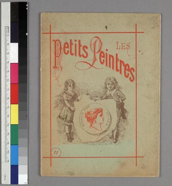 One boxed coloring set entitled Banner Crayon Outfit, manufactured by Milton Bradley Co., Springfield, Massachusetts, ca. 1915. This set is comprised of seven blind embossed coloring cards, six colored crayons attached to a single sheet of cardstock via elastic, and a chromolithograph-illustrated paperboard box. Directions for use are printed on the underside of the lid: "The crayons are to rub on the parts of the cards requiring color." The embossed coloring cards are untitled and unnumbered, and contain images and scenes of children and animals. All of the cards have been colored, and the crayons have been used as well. "Irene from Albert" is written in ms., in pencil, on the bottom of the box. A price tag of"$12.00" is affixed to the bottom of the box.