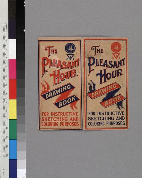 One drawing book/manufacturer's advertisement entitled The Singer Drawing Book for Young Artists, published by Singer Sewing Machine Co., ca. 1900. This promotional booklet contains 8 unnumbered pages of illustrations, each with its own sheet of tracing paper. The color illustration on the front cover is of three children gathered around a desk; the two little girls are watching the older boy draw. The color illustration on the back cover is the Singer Sewing Machine logo (a red S) superimposed on an image of a seated woman who is sewing with her Singer sewing machine. Some of the illustrations for tracing are promotional; the first image is of a sewing machine. The other illustrations are of children and animals. None of the images have been traced. "3-" (price) is written in ms. in the upper right-hand corner of the front cover.