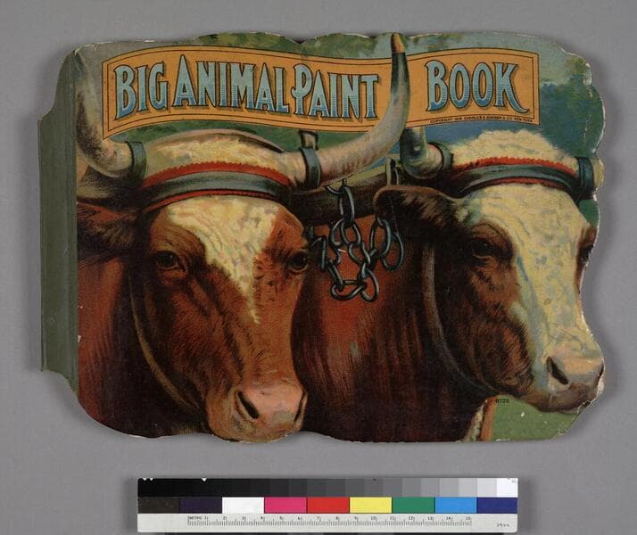 One painting book entitled Animals to Paint, published by the Saalfield Publishing Co., Akron, Ohio, 1910. The front cover of the book depicts a lion family; the name "Gerald" is written in ms., in pencil in the upper left-hand corner. The book consists of twenty-four outline images. The first page describes the book as: "a paint book for boys and girls which supplies sketches ready to color." and gives instructions on the use of watercolor. There book consists of twenty-four images of various animals, six of which have an identical color image meant to guide the student in the use of color. Most of the images have been filled in with crayon rather then watercolor.