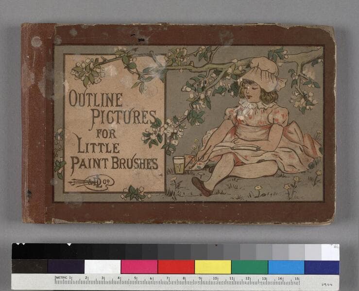 One painting book entitled Palette Painting Book, published by McLoughlin Bros., New York, copyright 1892. The cover of the painting book shows a young man holding a painted image while a young girl takes his arm. The back cover depicts a watercolor set, water, brushes, paint tube, and compass. The inside front cover lists "a few practical instructions for young painters" including suggestions on what colors to include in the student's watercolor set and how to mix them. The book is designed so that the student studies a colored image and then apply color to an outline image. There are a total of 22 images: eleven in color and eleven in outline. The images depict various scenes of people, children, animals, and nursery rhyme characters with tag lines at the bottom. None of the images have been filled in. A "10.00" is penciled in on the upper-right corner of the title page.