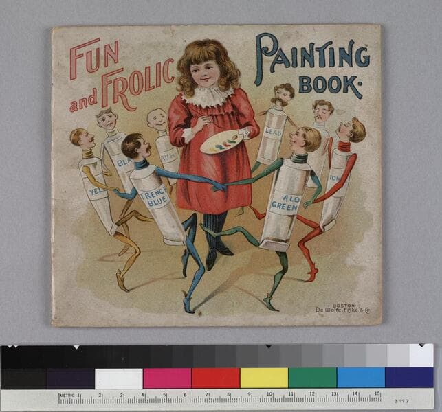 One painting book entitled The Little Folks Painting Book, by Kate Greenaway, published by McLoughlin Bros., New York, ca. 1910. This book is comprised of 15 plates of black and white images of children meant for coloring; many of these have been colored in. Each page contains four labeled images, one in each of the four quadrants of a page. The front cover is a chromolithograph of several children, one of whom is painting at an easel. The back cover is an illustrated publisher's advertisement for "Pantomime Toy Books." The inside of the front cover contains text in three parts: "The Little Folks Painting Book"; "A Few Practical Directions", and "Instructions for Mixing the Colors." The inside of the back cover contains publisher's advertisements.