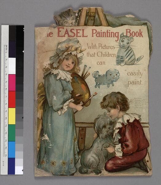 One painting book entitled Juvenile Painting Gallery, by F. I. Wetherbee, published by M.A. Donohue & Co., Chicago, copyright 1908. The subtitle on the title page reads: "Being a collection of the most artistic color schemes ever produced in an instructive painting book, teaching accuracy, harmony, beauty and color with pencil, paint and brush. Complete instructions for the little artist." This painting book is comprised of chromolithographic plates and black and white outline drawings for coloring. Descriptive, instructive and playful text accompanies each image. The lessons progress from fundamental to more complex, and include lessons on form, perspective, shape, proportion and shading. All of the images in this book are the same as those in Box 37 Env. 04. The front cover of this book is a chromolithograph of a boy at an easel outdoors painting a picture of a girl. The back cover is blank.