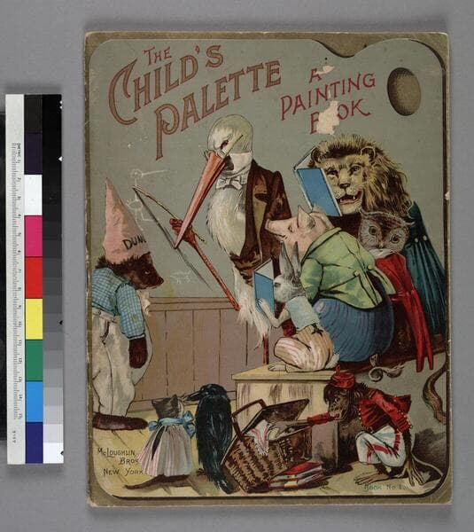 One painting book entitled Palette Painting Book, published by McLoughlin Bros., New York, copyright 1892. The cover of the painting book shows a young man holding a painted image while a young girl takes his arm. The back cover depicts a watercolor set, water, brushes, paint tube, and compass. The inside front cover lists "a few practical instructions for young painters" including suggestions on what colors to include in the student's watercolor set and how to mix them. The book is designed so that the student studies a colored image and then apply color to an outline image. There are a total of 22 images: eleven in color and eleven in outline. The images depict various scenes of people, children, animals, and nursery rhyme characters with tag lines at the bottom. None of the images have been filled in. A "10.00" is penciled in on the upper-right corner of the title page.